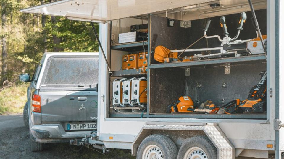 Een moderne uitrusting is cruciaal om efficiënt en ecologisch te kunnen werken. Wald Plus GmbH maakt gebruik van krachtige accugereedschappen van STIHL, zoals de FSA 400 bosmaaier en HTA 150 hoogsnoeier, maar ook van traditionele benzinemachines zoals de MS 400 C-M kettingzaag. Met ergonomische uitrusting, zoals de ADVANCE X-FLEX gordelsystemen, verhogen ze het comfort en de veiligheid van hun teams.