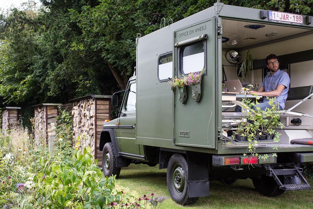Toon Roosen: “Het is een voormalige veldambulance van het leger, een jeep die ik mits enkele kleine ingrepen en met behoud van authentieke elementen ombouwde tot mobiel kantoor. Van twee draagberries maakte ik een tafel, verwarming was al aanwezig dus veel was er niet nodig. Ik zocht bewust naar een 4x4 model omdat ik overal moet geraken en bij aanvang zijn de tuinen of terreinen niet altijd even toegankelijk. Via een kennis kreeg ik dit exemplaar onder ogen en ik zag meteen de mogelijkheden. Het was het laatste exemplaar dat de garage in handen had. Ik twijfelde nog omwille van het ecologische aspect, maar anderzijds geef ik iets bestaands een nieuw leven en die voertuigen gaan eeuwig mee. Zeker omdat ik die enkel voor het veldwerk en het ontwerpen gebruik.”