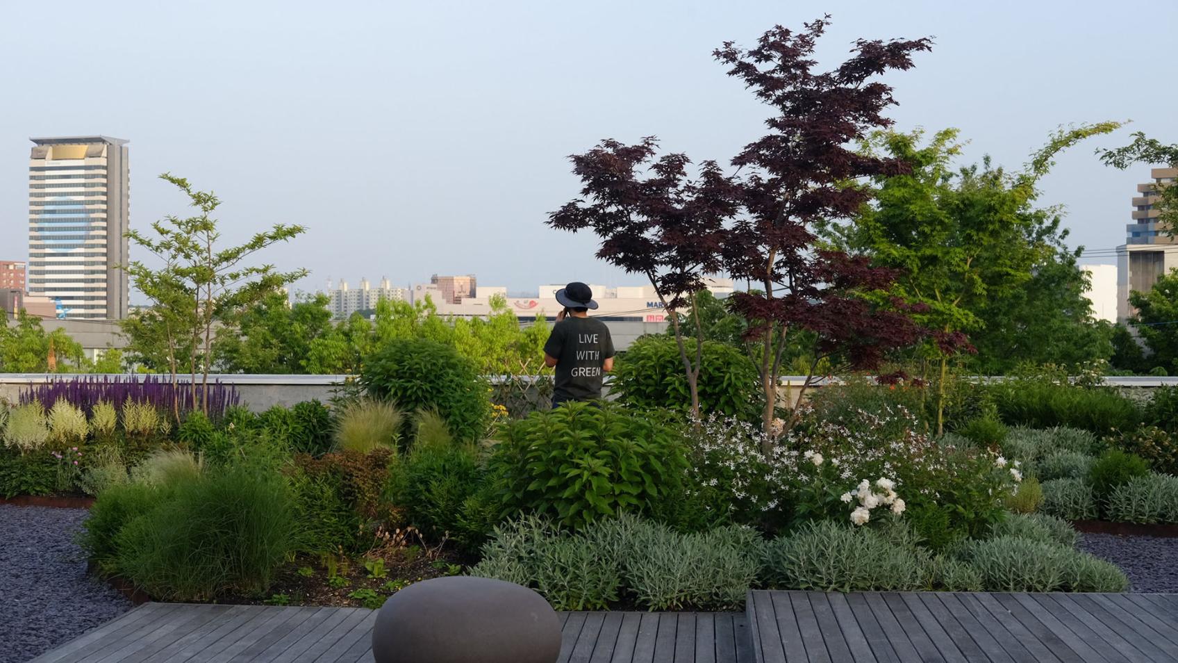 “Ik had voor mijn tuin Atelier Vierkant als sponsor gevraagd en ze stuurden me door naar een agent ter plaatse. Bleek dat het ook een landschapsontwerpbureau was, Greenwise Tokyo. Ik ontmoette de zaakvoerder die fan was van Piet Oudolf. Toen hij hoorde dat wij bevriend waren, vroeg hij me de daktuinen bij hun kantoor in Tokyo over twee niveaus voor hem te ontwerpen.”