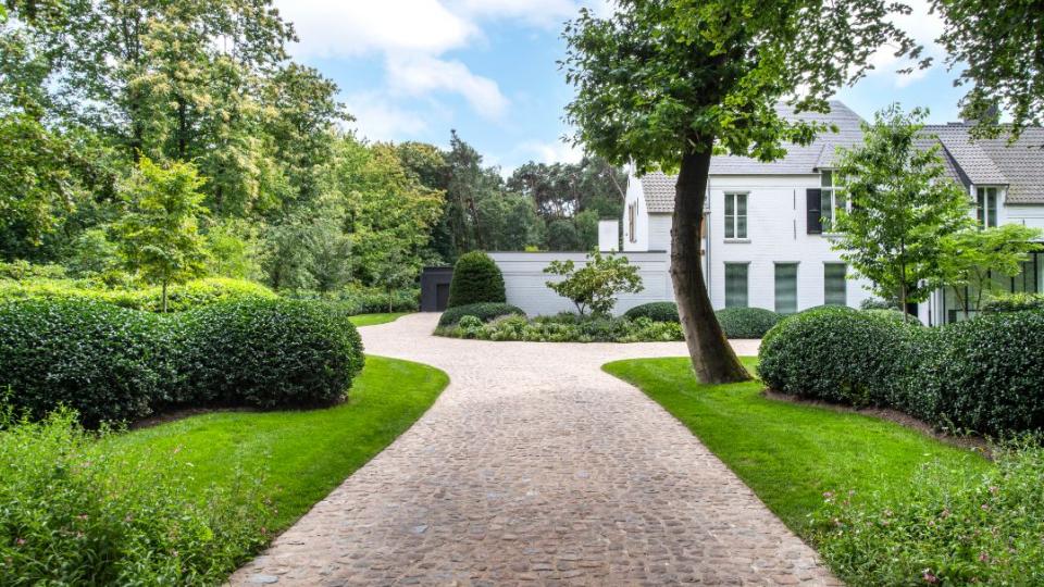 De imposante villa wordt omringd door groenblijvende snoeivormen in hulst. Dieper in de tuin verandert de beplanting in gemengde massieven en loopt het geheel langzaam over in bos. De paden rondom de villa zijn aangelegd in oude Hollandse recuperatieklinkers, terwijl de lichtjes verzonken oprit naar de woning geplaveid is met oude kasseien, type ‘vossekoppen’.