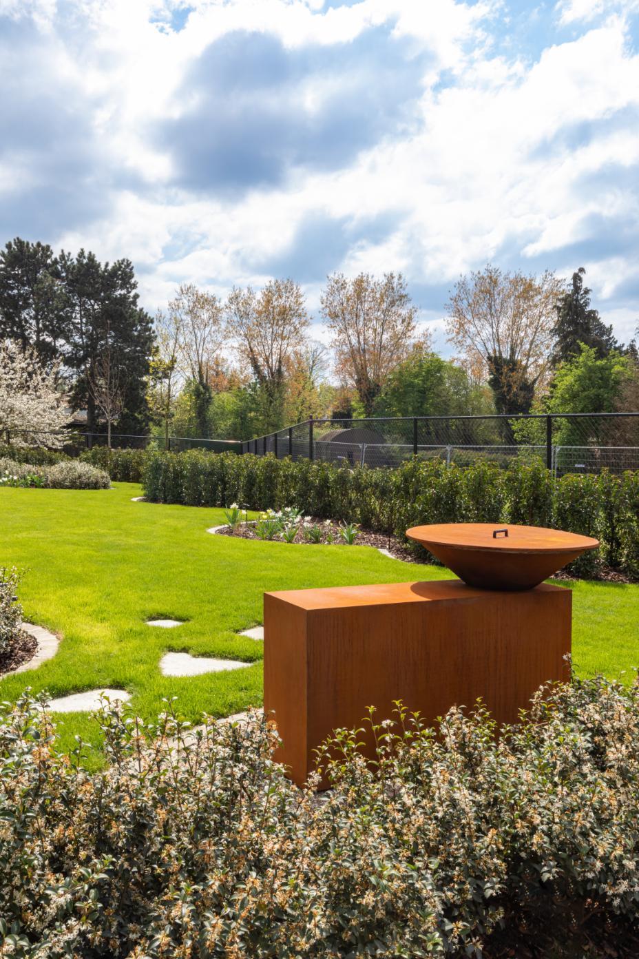 De eigenaars zijn harde werkers en wilden een tuin waarin ze kunnen genieten. Feestjes organiseren voor vrienden, hoort daarbij. Een bijgebouw met bar en open haard maakt dit mogelijk. Sport is voor de man dan weer een uitlaatklep, vandaar de vraag naar een vrij lang zwembad. En waarom is dit een Verdé tuin? “Alle ingrediënten worden in één coherent verhaal gekneed. Je ziet dat deze tuin ontworpen is. De geschoren organische wolkstructuren zijn aanwezig, net als de vaste planten en bloembollen en de bloesembomen. Elk seizoen en elk jaar zal de tuin evolueren en interessant zijn. Ook de wintergroene basis is een constante in al mijn projecten.”